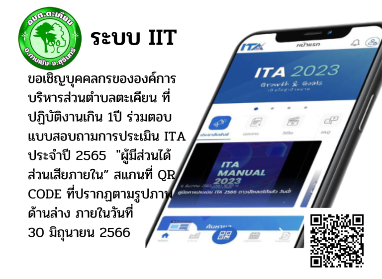 ขอเชิญบุคลากรขององค์การบริหารส่วนตำบลตะเคียน ที่ปฏิบัติงานเกิน 1ปี ร่วมตอบแบบสอบถามการประเมิน ITA ประจำปี 2565 "ผู้มีส่วนได้ส่วนเสียภายใน” สแกนที่ QR CODE ที่ปรากฏตามรูปภาพด้านล่าง ภายในวันที่ 30 มิถุนายน 2566