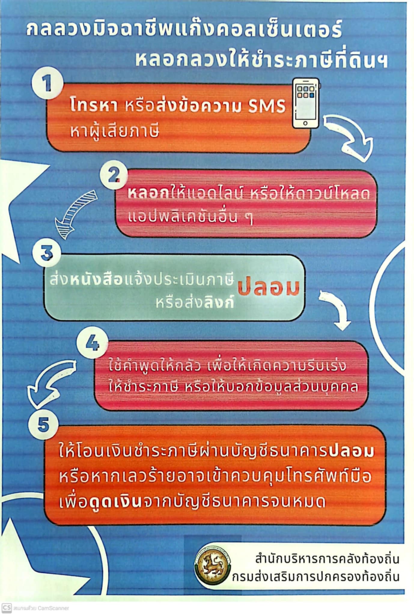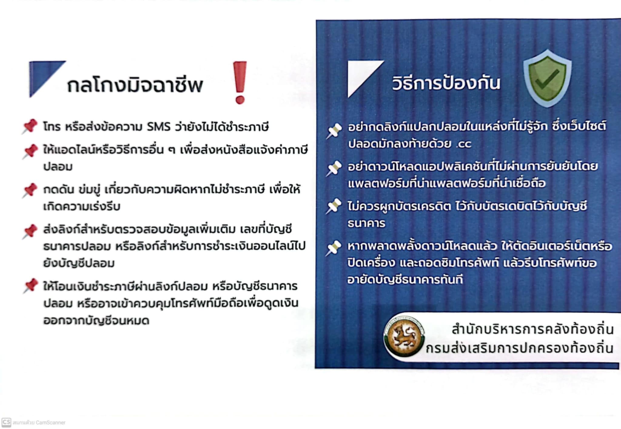 แจ้งเตือนประชาชนระมัดระวังกลุมมิจฉาชีพ แอบอ้างหลอกลวงเกี่ยวกับการทำธุรกรรมชำระภาษีที่ดินและสิ่งปลูกสร้าง
