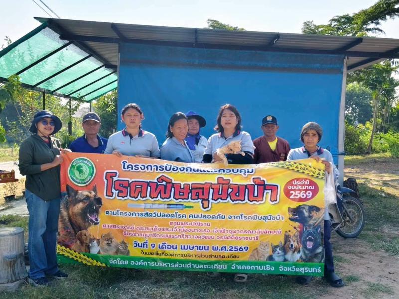 องค์การบริหารส่วนตำบลตะเคียนดำเนินการจัดโครงการป้องกันและควบคุมโรคพิษสุนัขบ้า ตามโครงการสัตว์ปลอดโรค คนปลอดภัยจากโรคพิษสุนัขบ้า ตามพระปณิธานศาสตราจารย์ ดร. สมเด็จพระเจ้าน้องนางเธอ เจ้าฟ้าจุฬาภรณวลัยลักษณ์ อัครราชกุมารี กรมพระศรีสวางควัฒน วรขัตติยราชนารี ประจำปีงบประมาณ 2569 วันที่ 9 เมษายน 2569 ณ พื้นที่ตำบลตะเคียน อำเภอกาบเชิง จังหวัดสุรินทร์