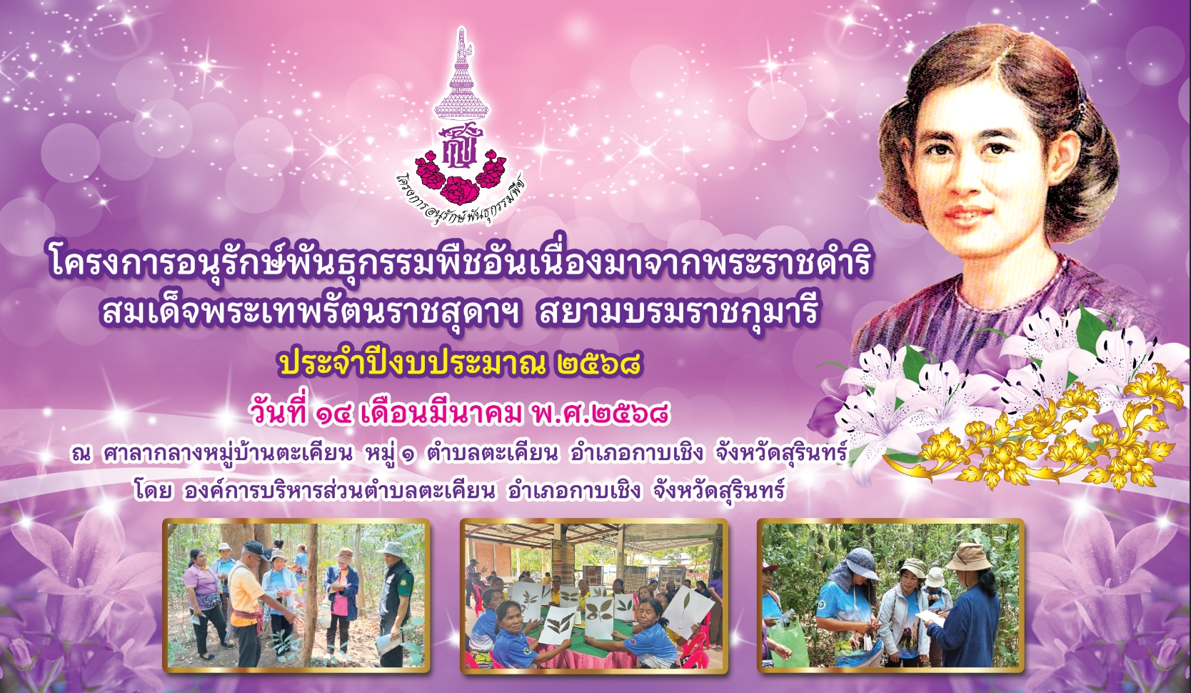 เมื่อวันที่ 14 มีนาคม 2568 แผนงานการเกษตร องค์การบริหารส่วนตำบลตะเคียนได้จัดโครงการ โครงการอนุรักษ์พันธุกรรมพืชอันเนื่องมาจากพระราชดำริ สมเด็จพระเทพรัตนราชสุดาฯ สยามบรมราชกุมารี ประจำปีงบประมาณ 2568 ณ ศาลากลางบ้านตะเคียน หมู่ 1 ตำบลตะเคียน อำเภอกาบเชิง จังหวัดสุรินทร์ โดยมีจำนวนผู้เข้าร่วมอบรม จำนวน 40 คน โดยมีวัตถุประสงค์ดังนี้