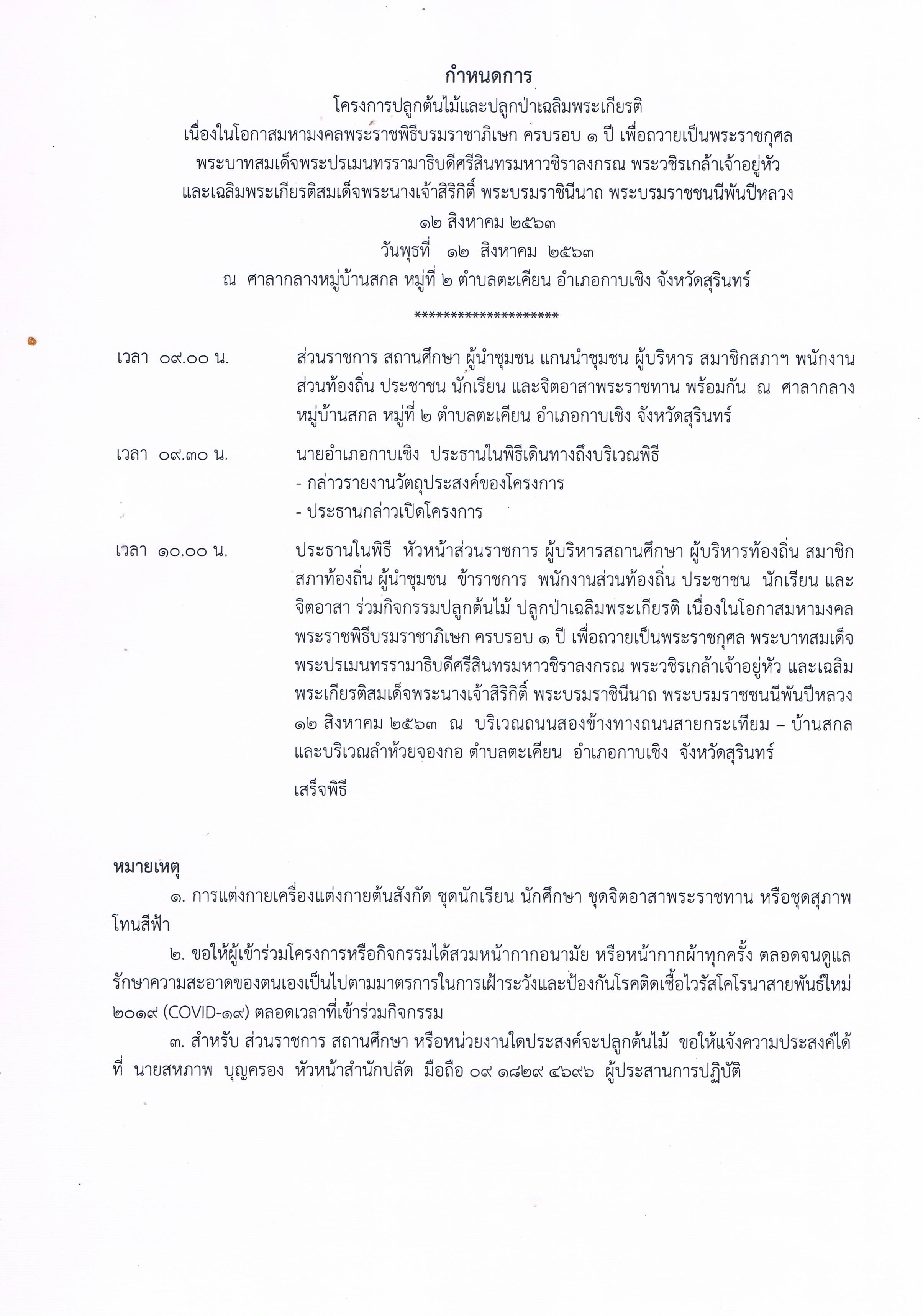องค์การบริหารส่วนตำบลตะเคียน ขอเชิญชวนพี่น้อง ประชาชนทุกท่าน ร่วมกิจกรรมปลูกต้นไม้และปลูกป่าเฉลิมพระเกียรติฯ ในวันพุธที่ ๑๒ สิงหาคม ๒๕๖๓ ณ ศาลากลางหมู่บ้านสกล หมู่ที่ ๒ ตำบลตะเคียน อำเภอกาบเชิง จังหวัดสุรินทร์