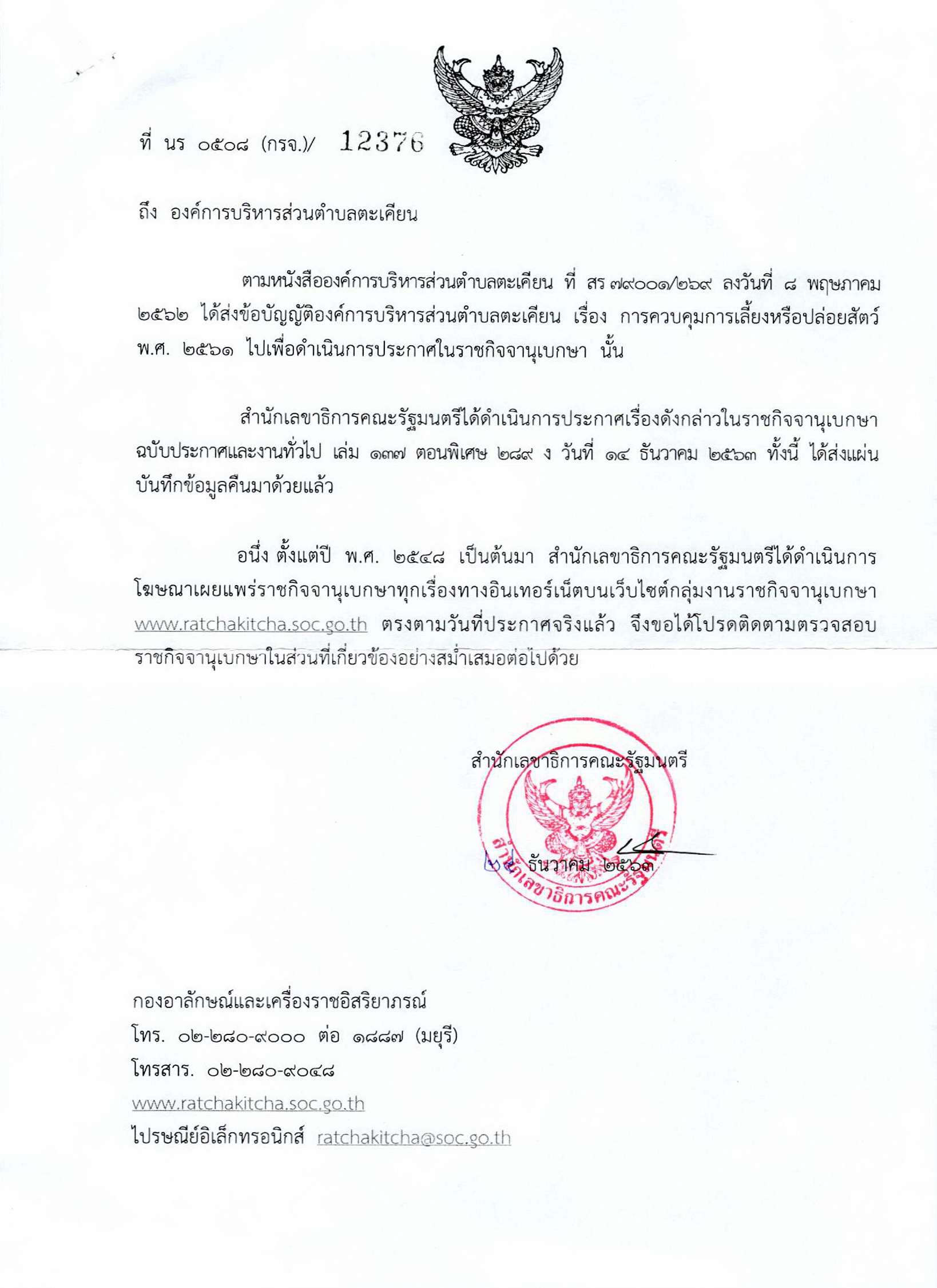 สำนักเลขาธิการคณะรัฐมนตรี แจ้งประกาศราชกิจจานุเบกษา เรื่อง การควบคุมการเลี้ยงหรือการปล่อยสัตว์ พ.ศ.๒๕๖๑ เรียบร้อยแล้ว