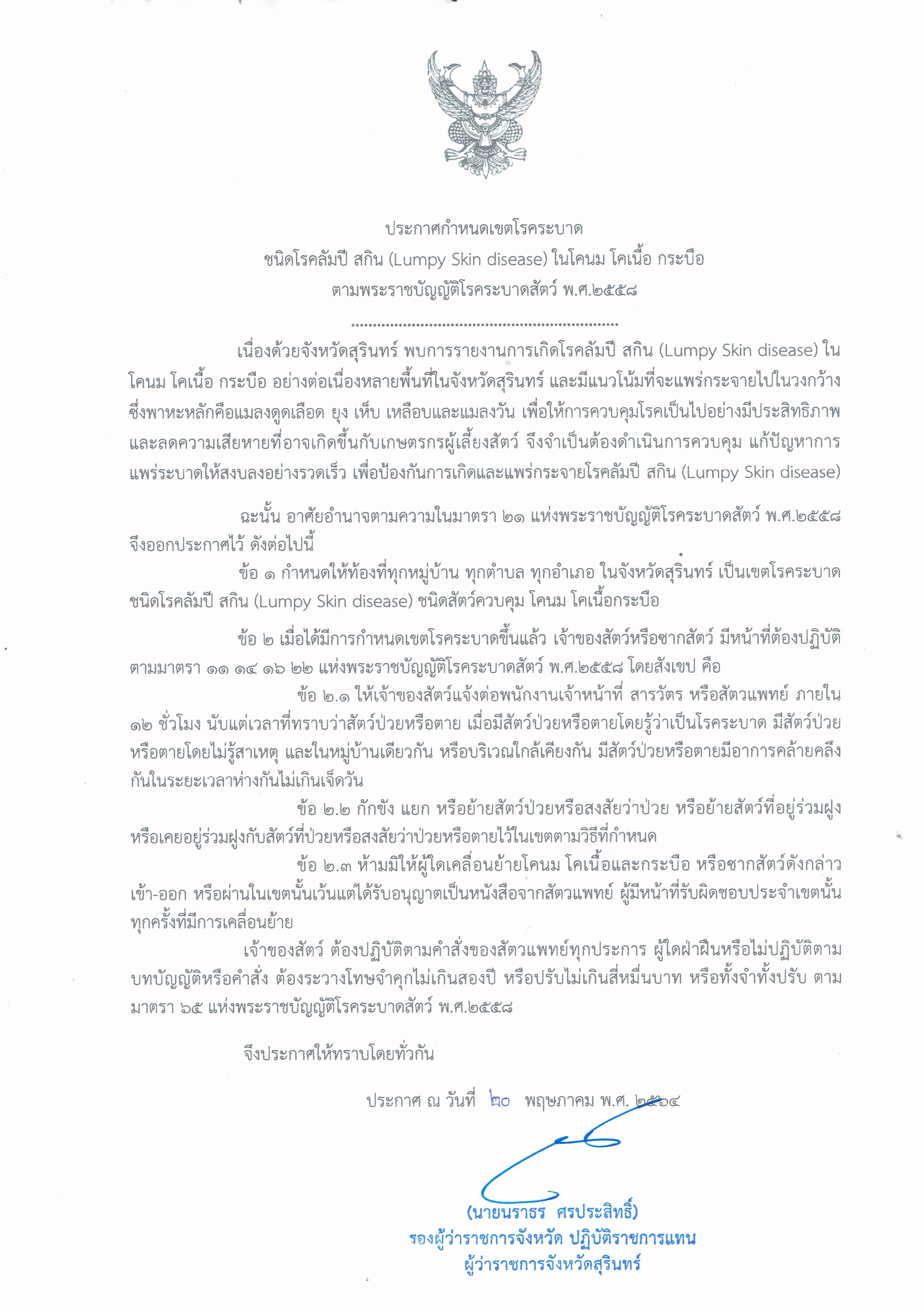 จังหวัดสุรินทร์ ประกาศกำหนดเขตโรคระบาดในท้องที่ทุกหมู่บ้าน ทุกตำบล ทุกอำเภอ ของจังหวัดสุรินทร์ เป็นเขตโรคระบาดชนิด โรคลัมปี สกิน (Lumpy Skin Disease) ในโคนม โคเนื้อ และกระบือ ตามพระราชบัญญัติโรคระบาดสัตว์ พ.ศ. 2558